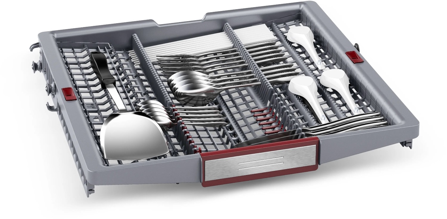 The redesigned cutlery tray provides secure, spacious storage for smaller kitchen items like coffee machine parts and bottle caps — freeing up more room below.