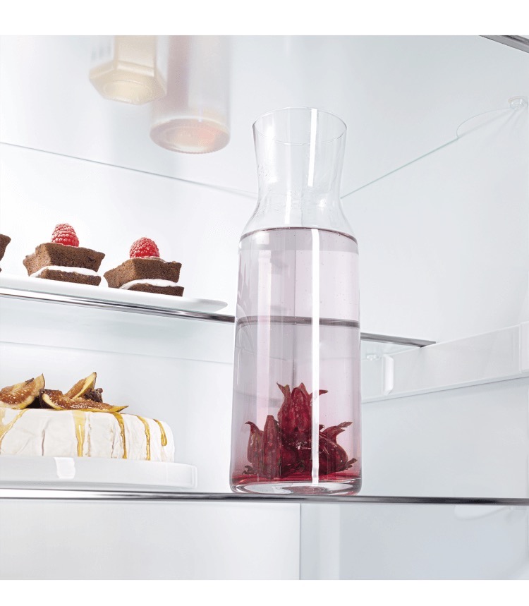The fridge is fitted with five high-quality glass shelves, four of which are height-adjustable, enabling you to adapt the layout to suit taller bottles, large containers or bulk food shops. The robust glass shelves are easy to clean and capable of supporting heavier items without flexing.
