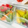 At the base of the appliance are two large transparent vegetable crisper drawers, designed to store fruit and vegetables at the correct humidity level to help maintain freshness for longer. Their clear fronts allow you to see contents at a glance, reducing food waste and making meal planning easier.