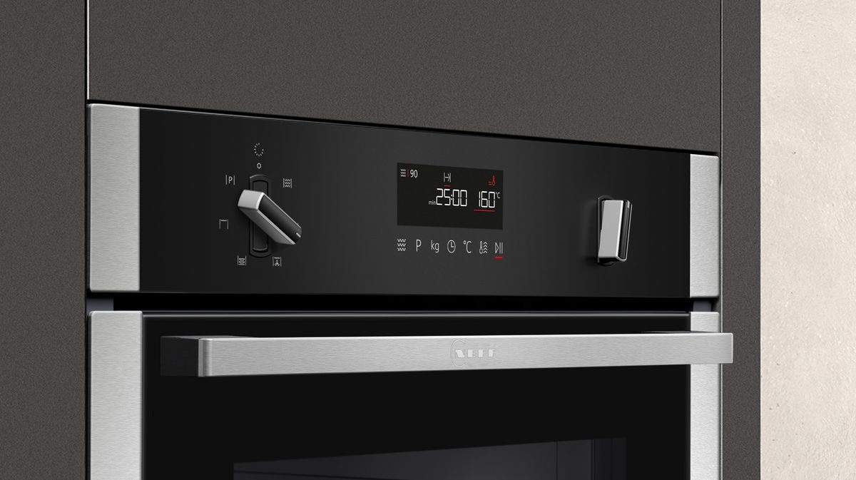 Finished in stylish black glass, the Neff N50 features a bar handle and retractable bevelled oval controls for a clean, modern appearance. The white LCD display provides clear visibility, while touch control and touch key operationensure intuitive, effortless use. An electronic clock timer helps you stay in control of every dish.